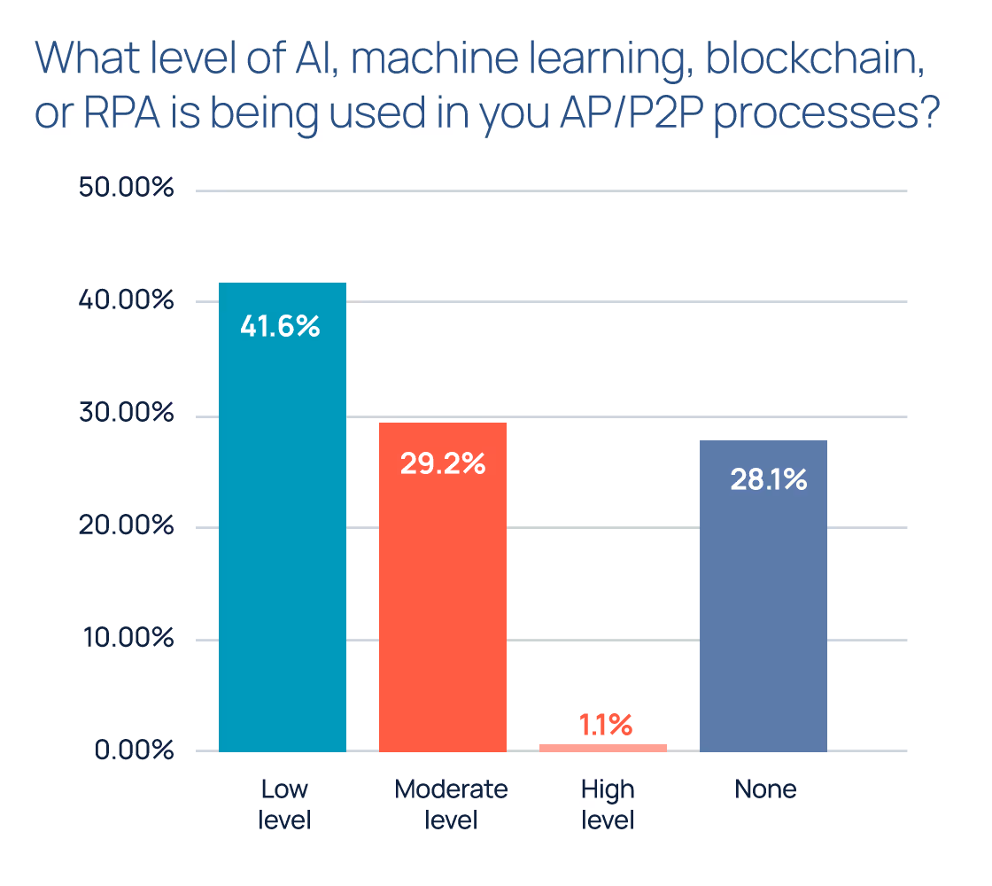The report suggests that most finance teams are in the early stages of digital transformation, with roughly 70% of respondents reporting a low level of advanced technology usage in their AP or procure-to-pay processes, or none at all.